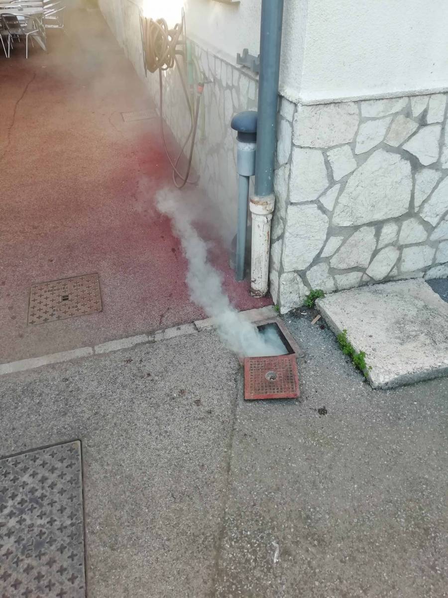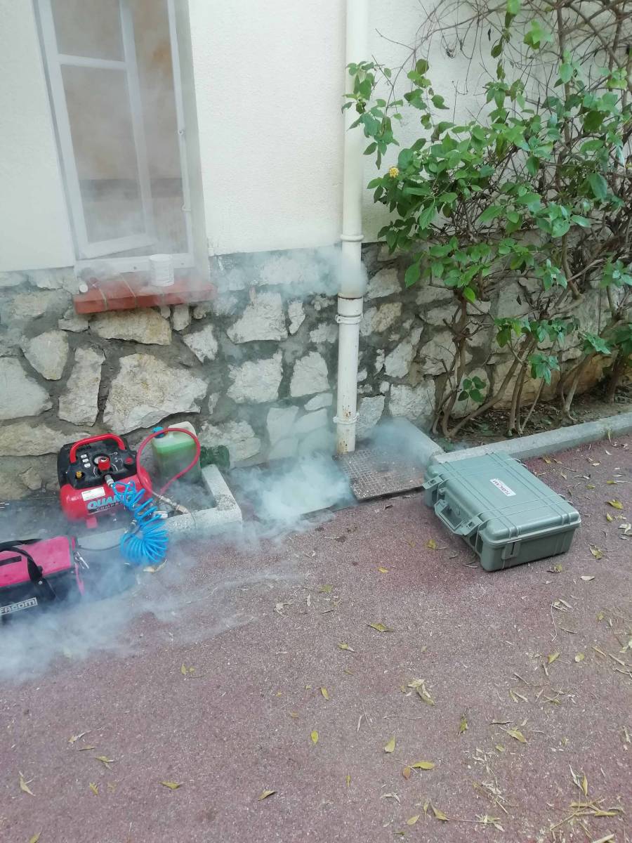 Nous avons donc réalisé un repérage des canalisations d’eau pluviale par fumigation, qui consiste à envoyer de la fumée dans une conduite, si elle n’est pas étanche la fumée va ressortir !